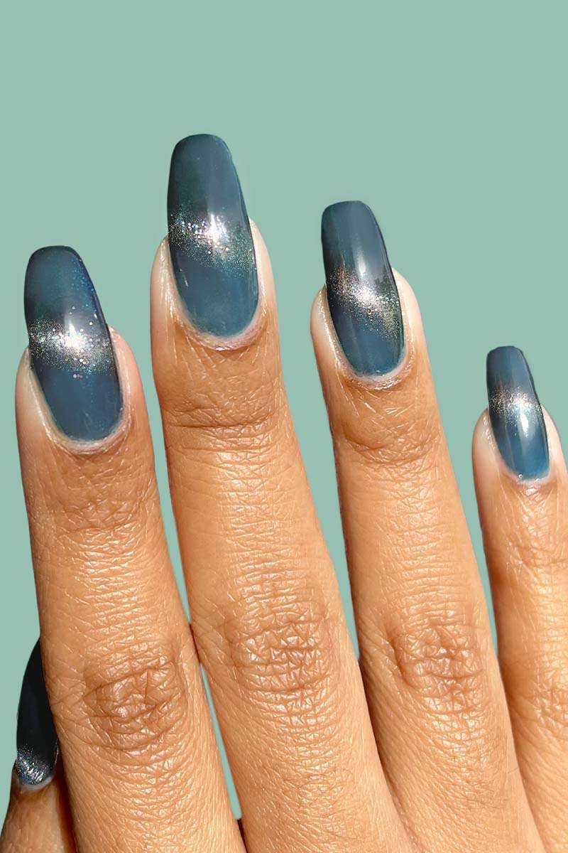 Delphinus is a teal blue nail polish with magnetic duochrome pigment that shifts between light pink and champagne.