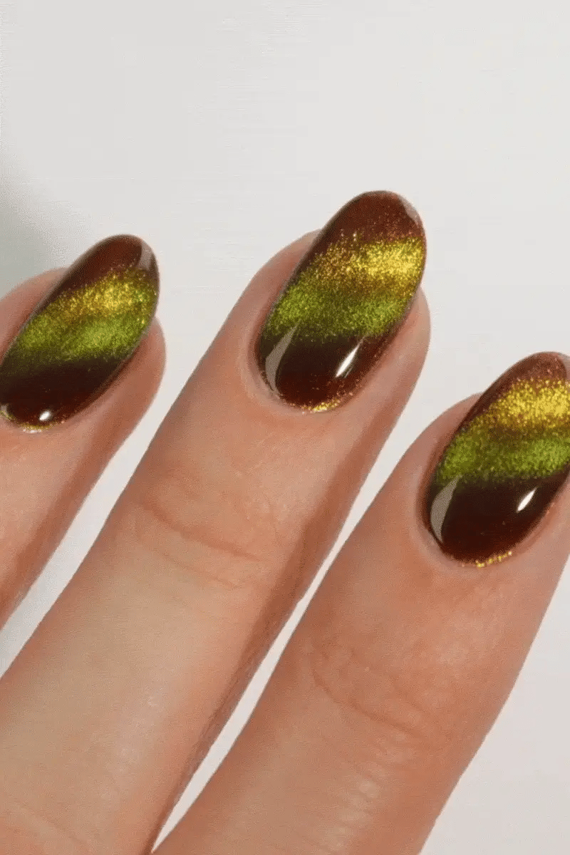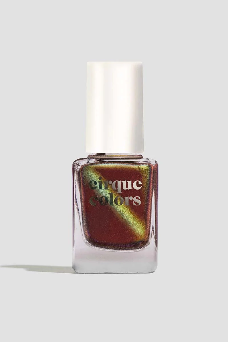 Delusions of Grandeur is an oxblood red nail polish with bronze-gold-green multichrome magnetic pigment.