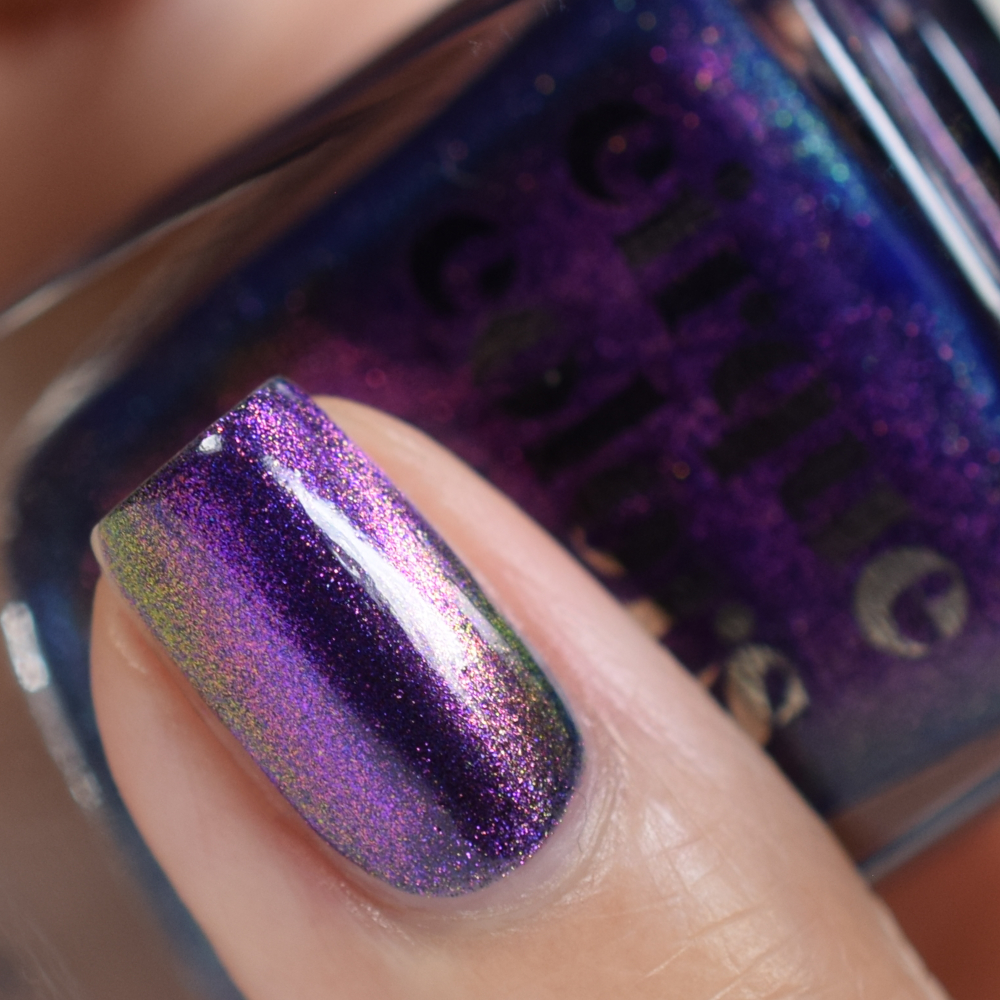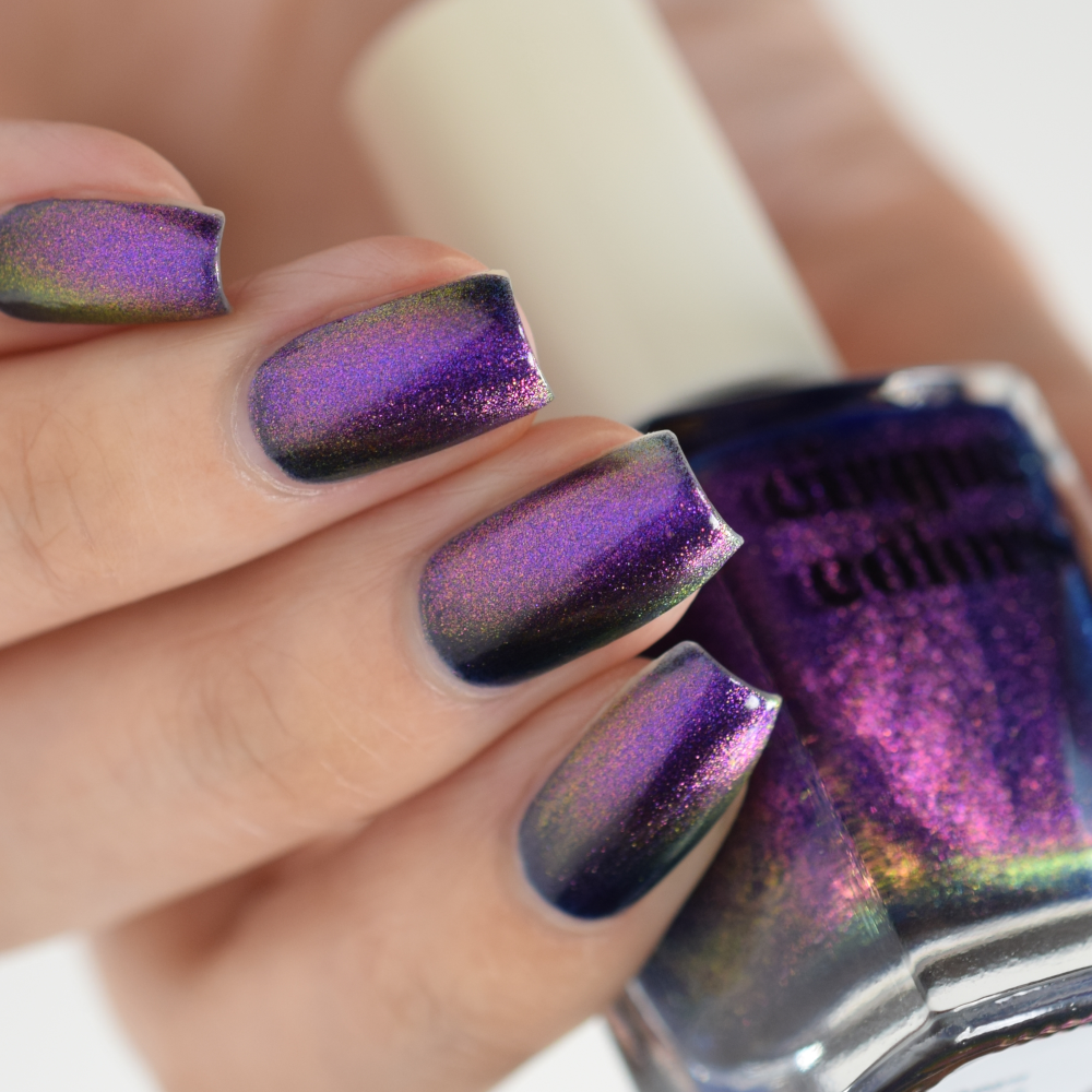 Dream Within a Dream is an indigo blue jelly nail polish with mesmerizing magnetic multichrome pigment that shifts between magenta pink, amber gold and pear green.