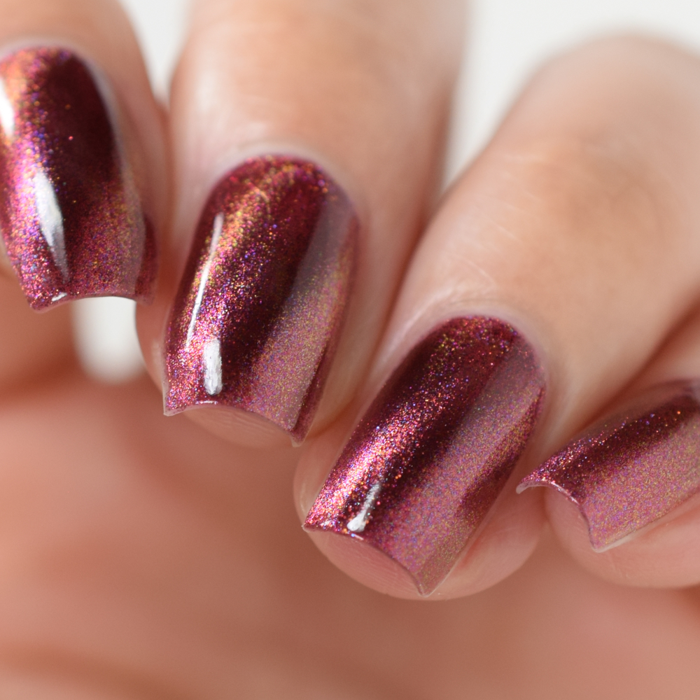 Kinetic is a burgundy red jelly nail polish with mesmerizing magnetic multichrome pigments that shifts between rosebud pink and watermelon coral.