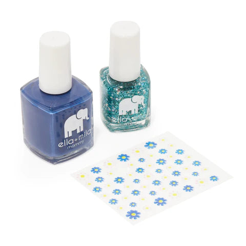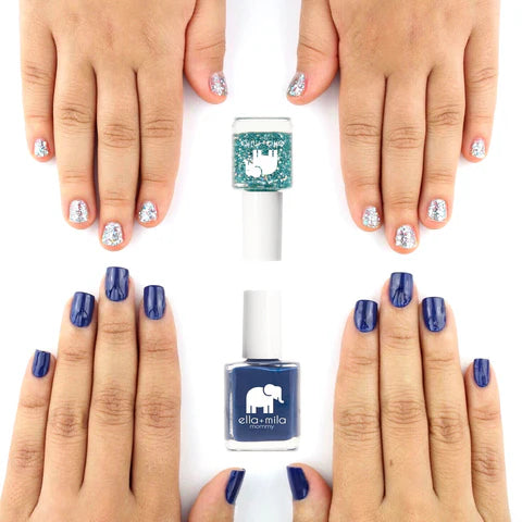 Nail polish set with one "mommy" nail polish bottle (14.78 ml) and one "me" nail polish bottle (7 ml). Included in this set is one nail decoration sheet.
